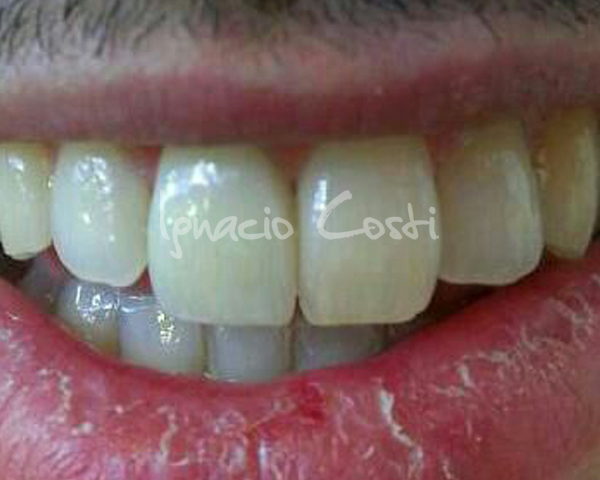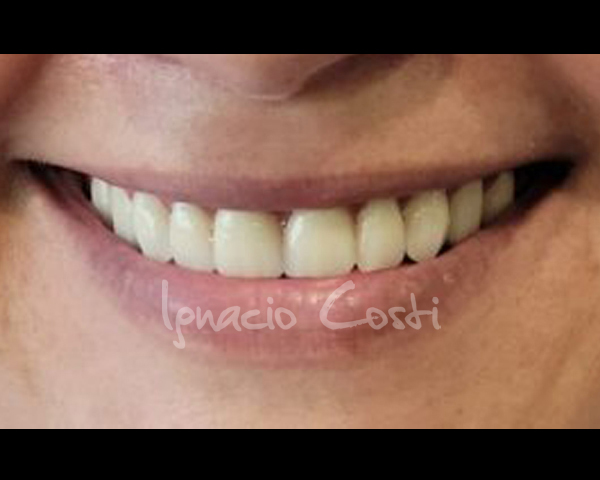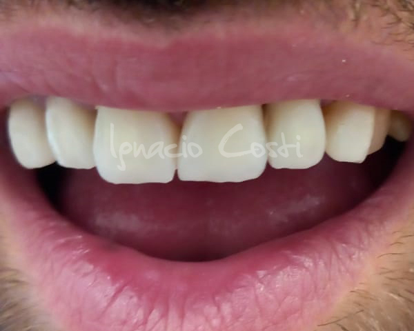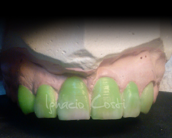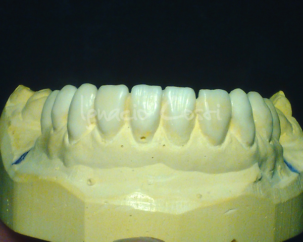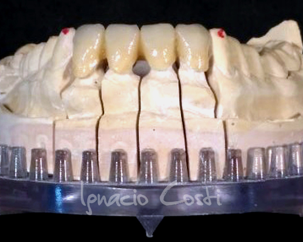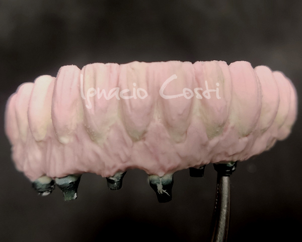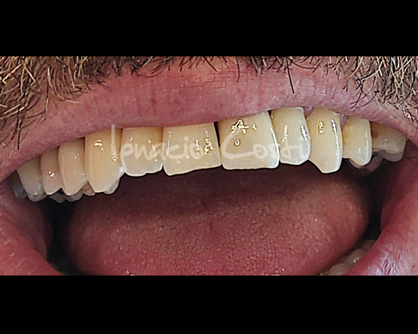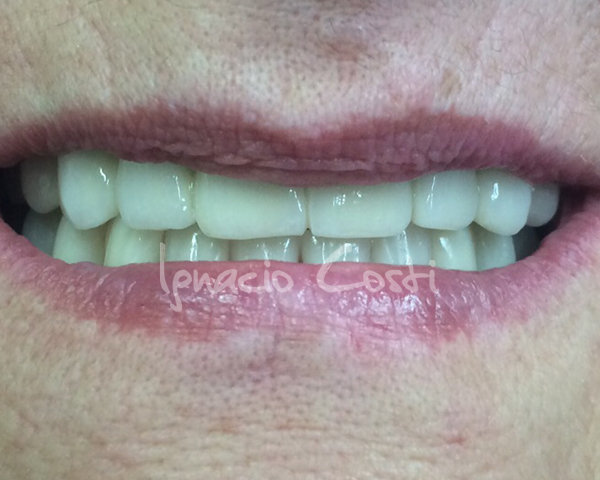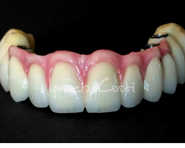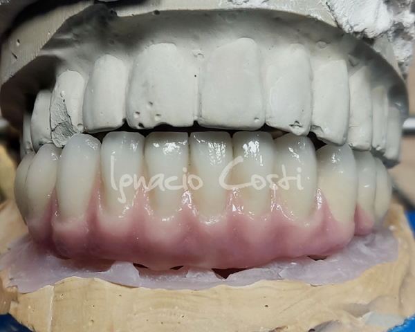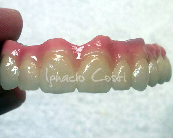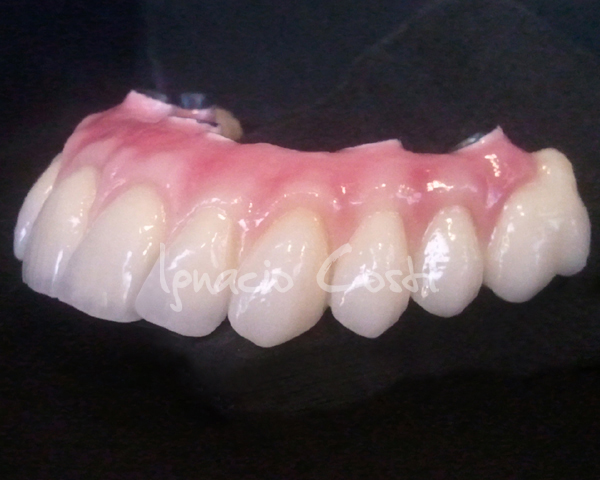 Rehabilitación superior sobre implantes con estructura sinterofresada y estratificación de piezas y encía con cerámica GC.
