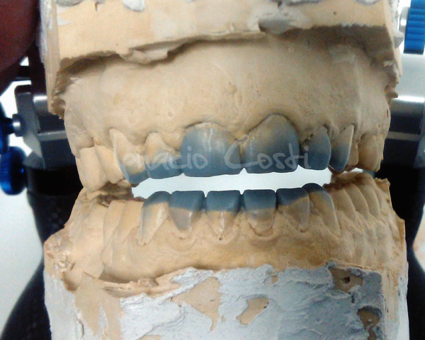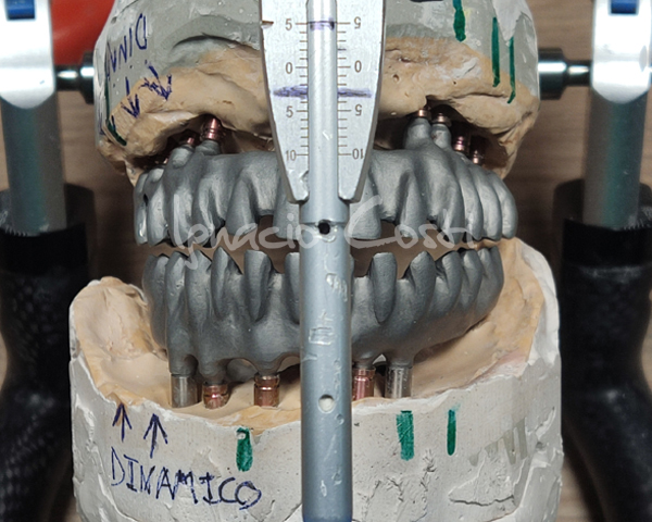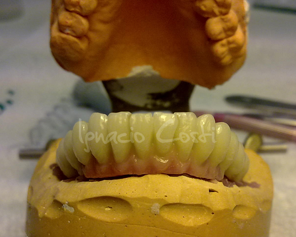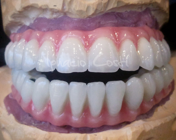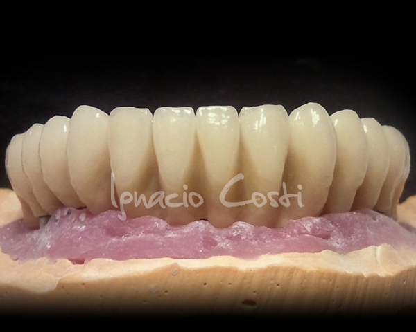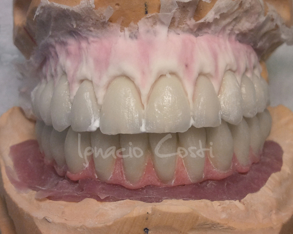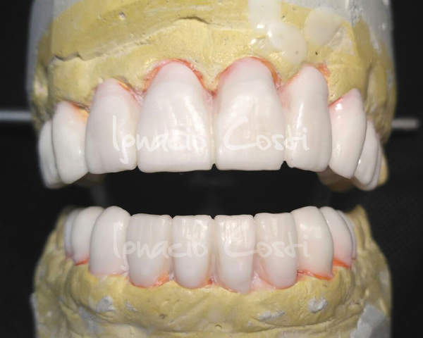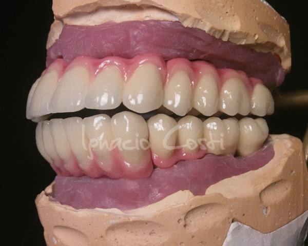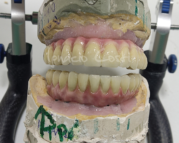 Rehabilitación superior e inferior sobre implantes con estructuras sinterofresadas y estratificación de piezas con cerámica GC.